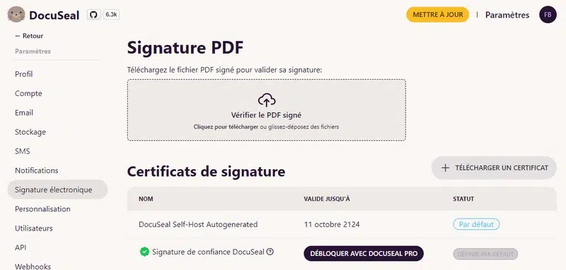 Terminons par un dernier point : la section "Signature électronique" des paramètres. Par défaut, DocuSeal utilise un certificat auto-signé pour la signature des documents. Ainsi, le document sera signé et la signature contiendra les informations sur les signataires, mais le certificat contiendra des avertissements. En effet, puisqu'il est auto-signé, il n'est pas possible de vérifier son authenticité.
