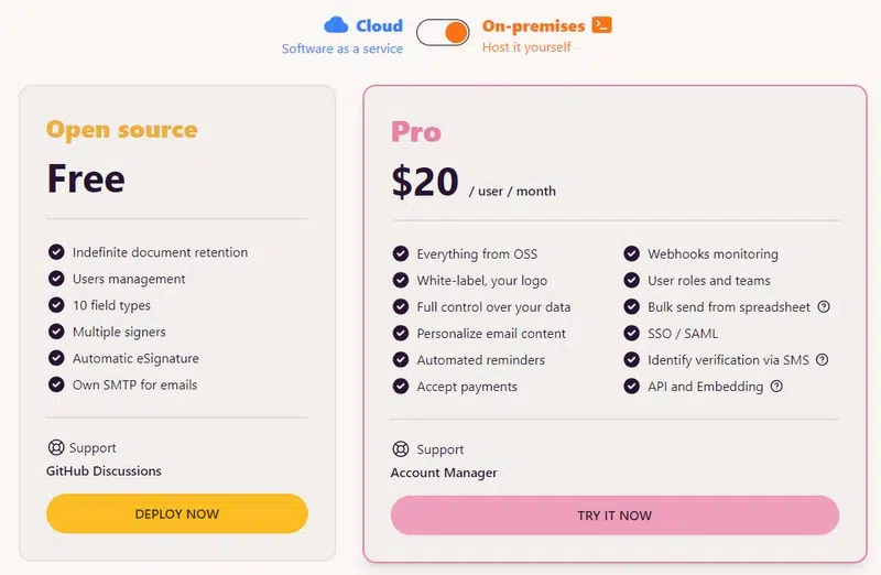 Remarque : même si vous auto-hébergez DocuSeal sur votre propre serveur, certaines fonctionnalités sont bloquées et nécessitent un abonnement Pro pour être accessibles.