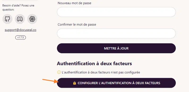 Tout d'abord, je vous encourage à l'activer le MFA sur le compte administrateur de la plateforme DocuSeal. Pour cela, cliquez sur "Paramètres" puis "Profil" où vous pourrez localiser l'option "Authentification à deux facteurs". Vous pouvez utiliser une application comme Microsoft Authenticator, Google Authenticator ou FreeOTP.