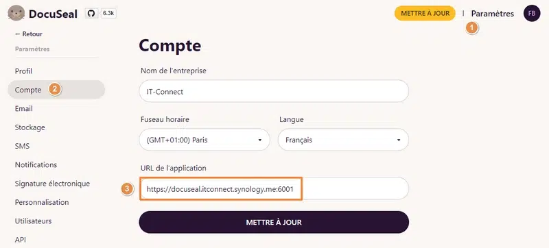 Cliquez "Paramètres", puis sur "Compte" afin d'accéder à l'option "URL de l'application". Ici, il est important de configurer l'URL d'accès à l'application DocuSeal, parce qu'elle sera utilisée pour construire les liens vers les documents à signer.