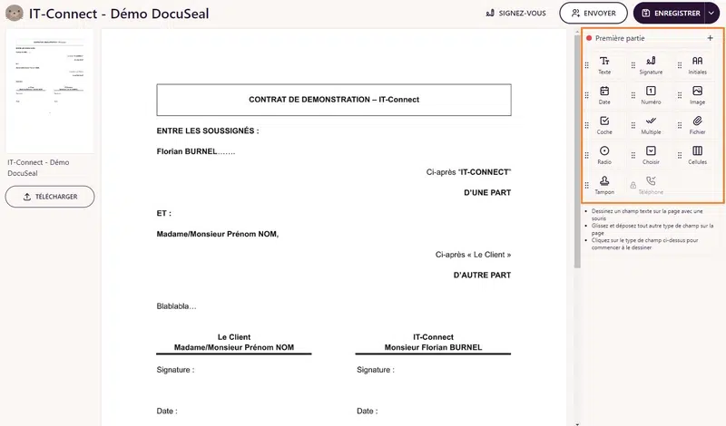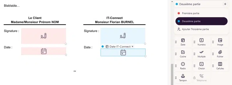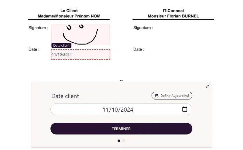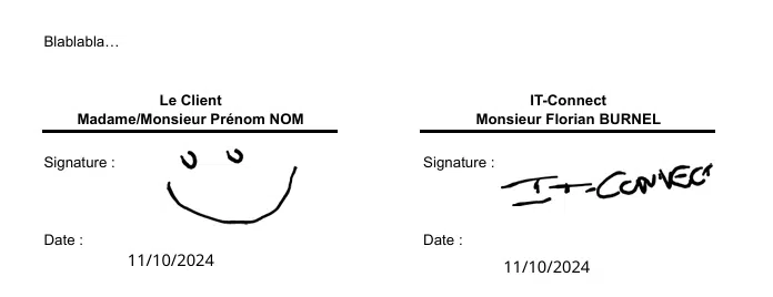 Dans le cadre de cette démonstration, j'ai chargé un document PDF correspondant à un contrat fictif au nom d'IT-Connect. À la fin de ce contrat, il y a deux parties réservées aux signatures. De façon traditionnelle, il conviendrait d'imprimer ce document et de le remplir en indiquant la date et en effectuant une signature manuscrite avec un stylo. Mais, là, nous allons effectuer une signature électronique.
