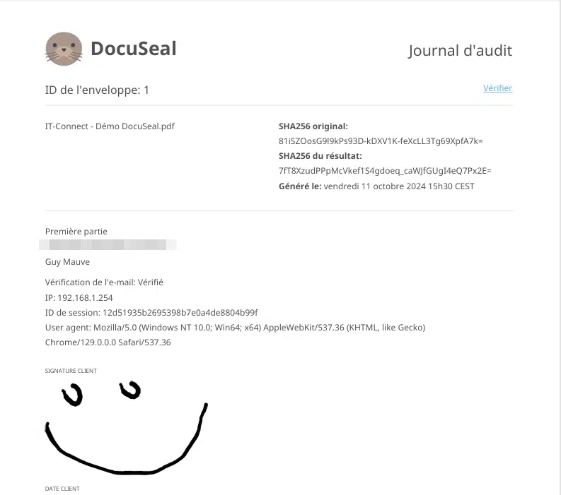 En plus du document signé, une autre pièce jointe est présente dans l'e-mail : le journal d'audit. Il permet d'avoir des informations sur les signataires, sur l'authenticité de la signature et il intègre l'historique des événements : heure d'accès au contrat, heure de signature de chaque partie, etc... Il retrace la chronologie des événements.