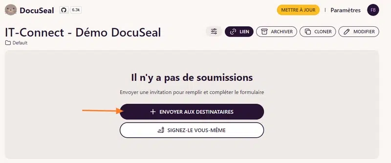 Afin d'effectuer un essai et créer une demande de signature, vous devez cliquer sur le bouton "Envoyer aux destinataires".