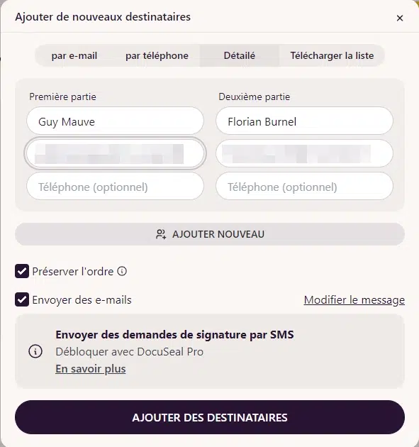 Ensuite, vous devez spécifier les informations sur les destinataires : nom, prénom et adresse e-mail. Il est envisageable d'ajouter le numéro de téléphone, mais la notification par SMS nécessite DocuSeal Pro.
