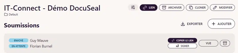 Une fois que vous avez validé, vous pourrez voir l'état de votre soumission sur l'interface de DocuSeal.