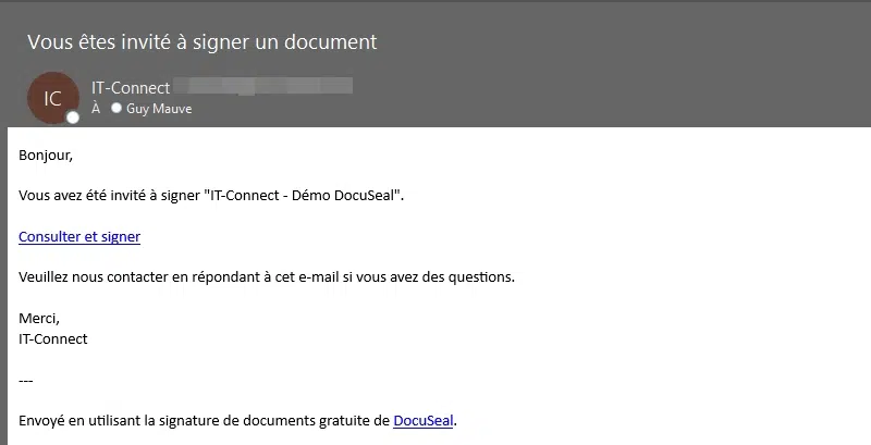 Une notification par e-mail a été envoyée à la partie 1, à savoir Guy Mauve, afin de l'inviter à signer le document. L'utilisateur doit cliquer sur le lien pour accéder au contrat fictif.