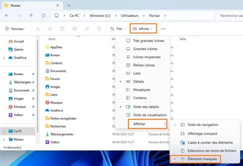 Sinon, à partir de l'Explorateur de fichiers, vous pouvez navigateur dans "C:\" puis "Utilisateurs", et ensuite dans le répertoire correspondant à votre session afin d'aller dans "AppData". Mais avant cela, vous devez afficher les éléments masqués comme le montre l'image ci-dessous.