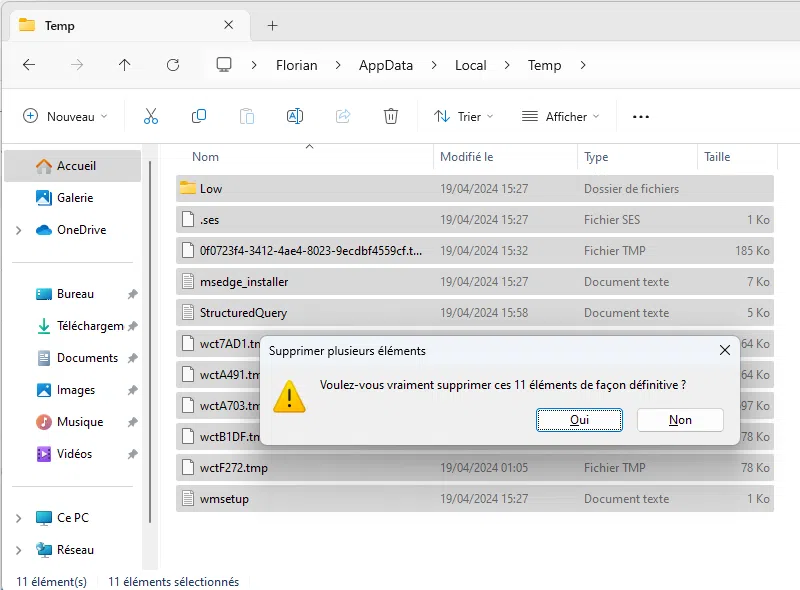 Ensuite, sélectionnez tout le contenu du dossier, puis appuyez sur "Maj + Suppr" pour supprimer ces données de façon définitives. Validez avec "Oui" et patientez.
