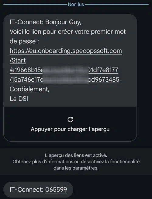 Désolé mais envoyer un mot de passe pour un onboarding sur mon telephone perso c’est non hormis la RH pour les besoins urgent de communication le reste de la société n’a pas a connaitre mon téléphone perso et je me demande si conforme au RGPD