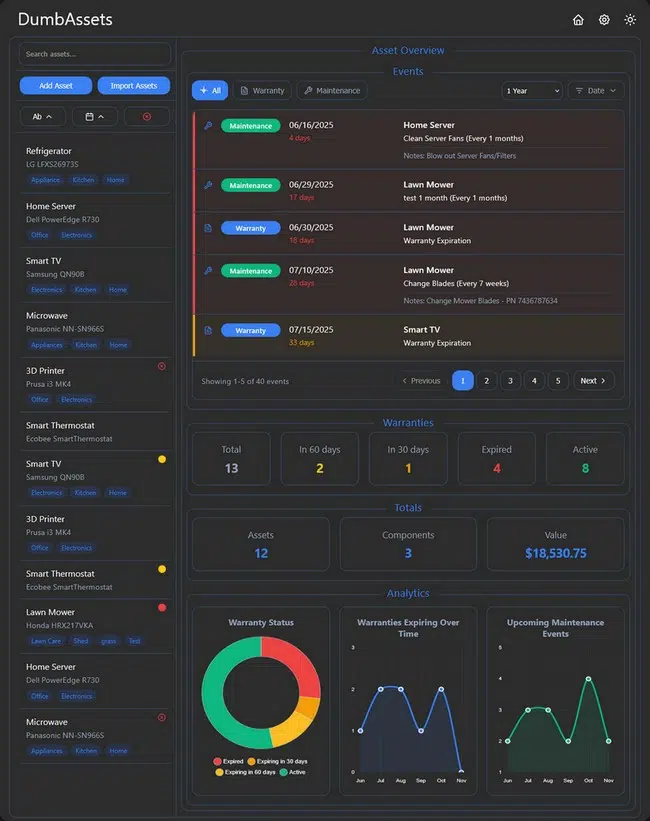 DumbAssets est une application web légère conçue pour permettre de gérer simplement un inventaire d'équipements informatiques (et de divers appareils). Elle est adaptée pour un home lab ou un petit environnement professionnel. Pensée pour être auto-hébergée et rapide à mettre en place, son objectif est de fournir une interface claire pour organiser, visualiser et documenter l'ensemble des actifs physiques et logiciels d’un environnement informatique.