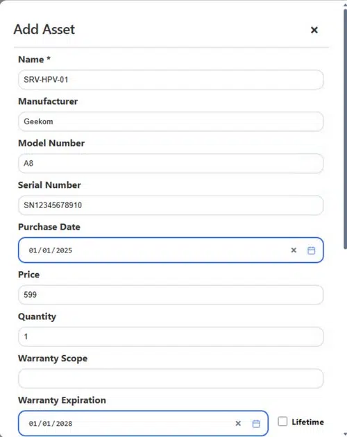 - Suivi des garanties de vos équipements : chaque actif peut être associé à une date de fin de garantie et l'application en fait le suivi.