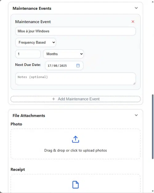Lors de l'ajout d'un équipement, vous avez une multitude de champs disponibles, comme vous pouvez le voir sur les images ci-dessous. Vous pouvez ajouter des pièces jointes (photos, documents) et associer des tâches de maintenance avec une récurrence à chaque équipement.