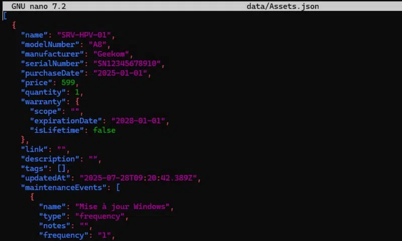 /data/Assets.json: contient l'ensemble des données relatives à vos équipements principaux (assets/actifs)./data/SubAssets.json: enregistre les composants ou sous-éléments associés aux actifs./data/Images: répertoire utilisé pour stocker les photos téléchargées./data/Receipts: répertoire destiné aux justificatifs et factures liés aux actifs./data/config.json: fichier de configuration de l'application, incluant les paramètres de notification.