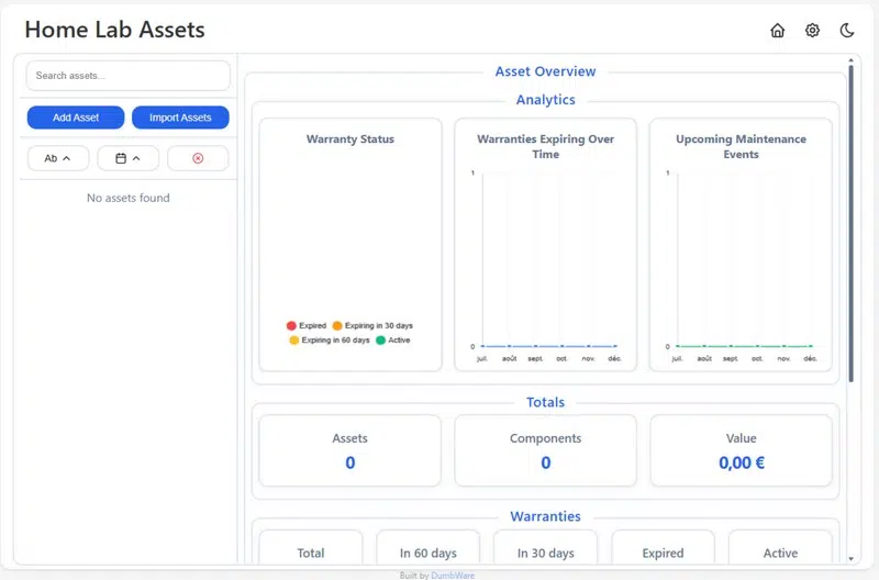Ensuite, vous arrivez sur le tableau de bord de l'application. Sans surprise, tout est vide : vous devez donc ajouter vos équipements. Pour ajouter un nouvel appareil, cliquez sur le bouton "Add Asset". Pour effectuer un import en masse, notamment via un fichier CSV, cliquez sur le bouton "Import Assets" (un modèle est proposé pour vous aider).