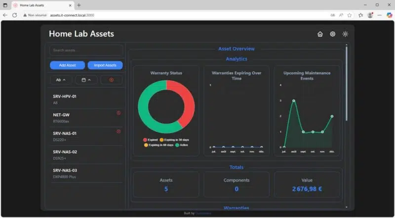 Cette solution est intéressante pour suivre l'inventaire de votre matériel, avec la garantie, et même gérer les tâches de maintenance associées. Vous pouvez tout à fait y ajouter votre ordinateur, votre NAS (et rattacher les disques en tant que composant), et pourquoi pas enregistrer aussi votre cafetière. Il n'y a pas de limitation : vous ajoutez les appareils de votre choix.