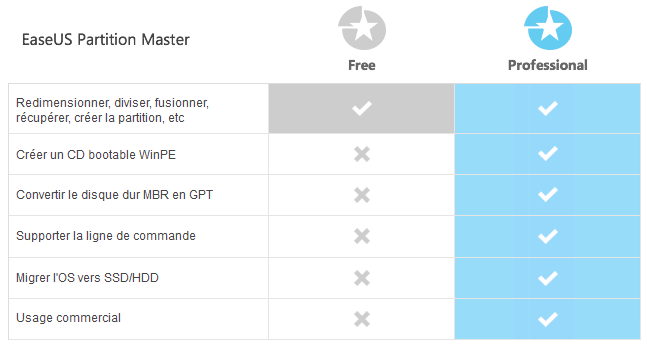 En résumé, là où l'outil intégré à Windows est capable de convertir un disque en MBR ou GPT, de créer, supprimer et formater des partitions, d'étendre ou de réduire des volumes, de modifier la lettre d'un lecteur, le logiciel EaseUS en version Free offre des fonctionnalités supplémentaires :