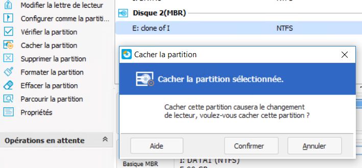 En sélectionnant une partition, on peut la cacher simplement en cliquant sur le bouton "Cacher la partition".
