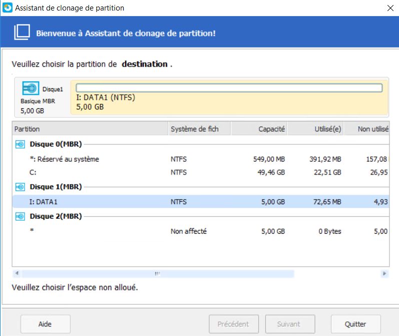 L'assistant se lance et nous demande de choisir la partition de destination.