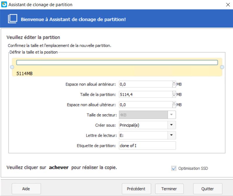 On peut alors paramétrer différents éléments, comme la taille de la partition de destination, ou encore son nom.