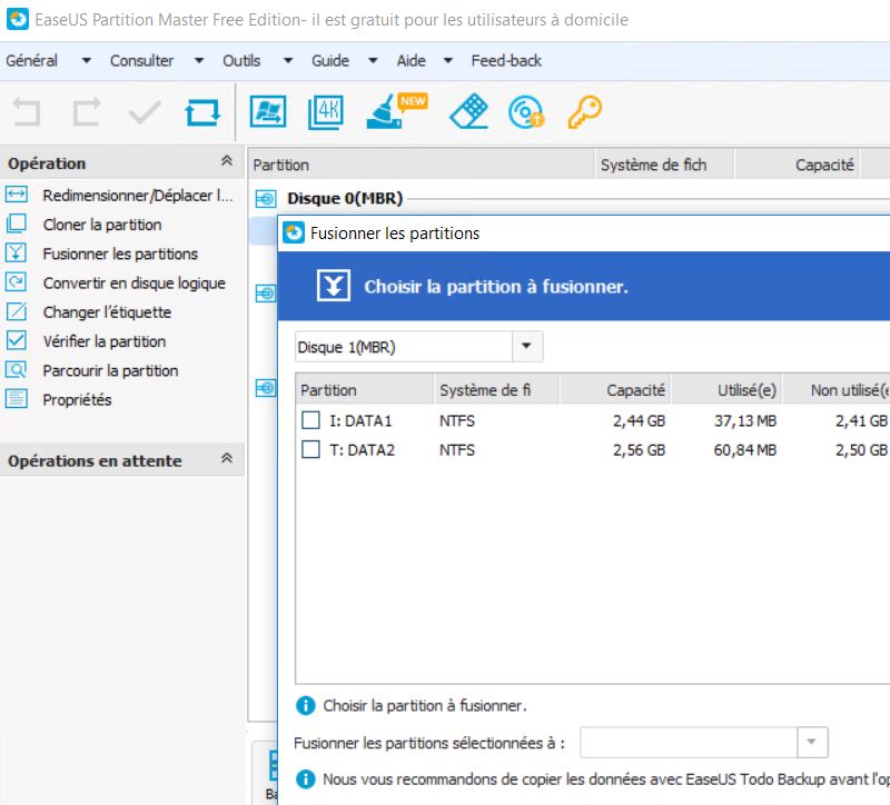 Il suffit de cliquer sur le bouton "Fusionner les partitions" sur la gauche, ensuite de sélectionner le disque, puis les partitions.