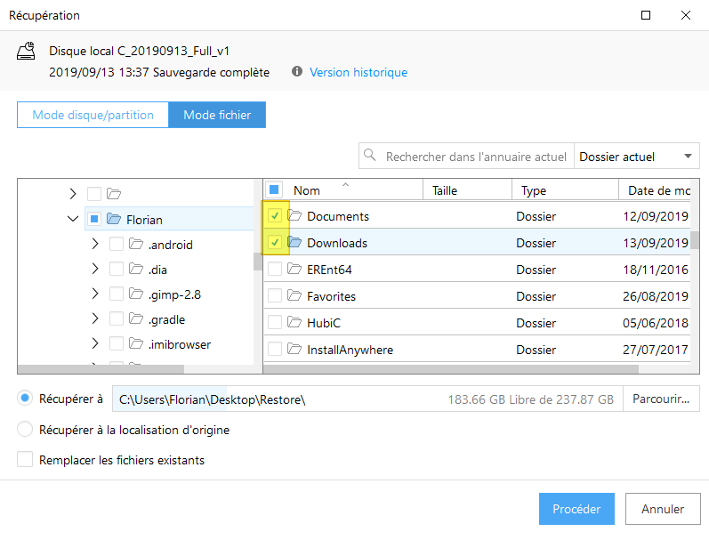 Lors de la restauration que j'ai réalisée, à partir d'un disque dur externe connecté en USB 3.0, la restauration a durée 3 minutes pour 600 Mo de données, correspondantes à 3 745 fichiers.