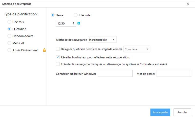 Dans la version gratuite, la planification est disponible. Une bonne nouvelle pour avoir une sauvegarde automatique de son disque, tout en sachant que l'on peut faire une sauvegarde complète à chaque fois, ou une incrémentielle ou différentielle.