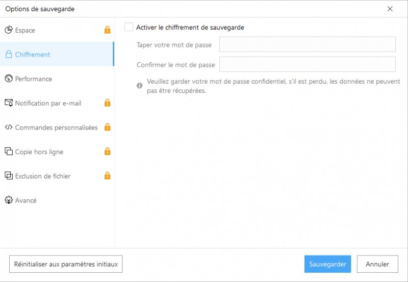 Vous l'aurez compris, les menus où il y a un cadenas sont ceux verrouillés dans la version gratuite. Le chiffrement est proposé dans la version gratuite, ce qui est un bon point. L'onglet Performance permet d'ajuster la priorité du processus au niveau de Windows, ce qui jouera sur les ressources consommées. En complément, il est également possible de limiter la vitesse de transfert par le réseau.