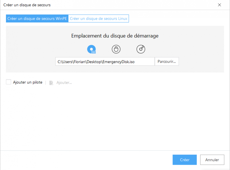 Le logiciel d'EaseUS propose également de créer un disque de secours basé sur WinPE (ou Linux, au choix) et que vous pouvez créer au format ISO ou directement sur une clé USB. Sur un PC où Windows ne démarre plus, il représente une roue de secours très intéressante. En effet, vous pouvez accéder à EaseUS Todo Backup depuis cette interface afin de restaurer une image du système et de récupérer un système fonctionnel.