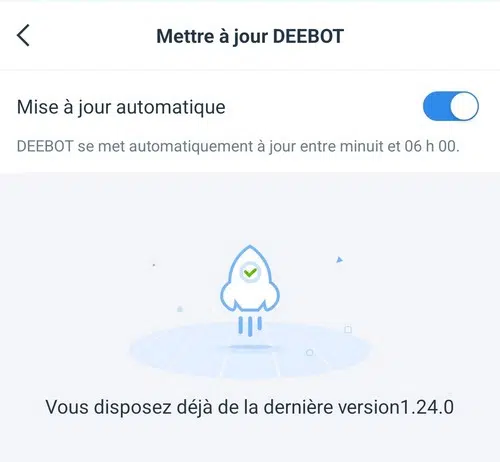 L'application Ecovacs Home peut vous permettre de mettre à jour votre Deebot, tout en sachant qu'il l'a peut être déjà fait tout seul : les mises à jour automatiques sont activées par défaut et sont réalisées la nuit. "Nous avons proactivement envoyé la mise à jour à tous les utilisateurs.", précise Ecovacs. Néanmoins, il est préférable de le vérifier par vous-même en accédant aux paramètres de l'application.