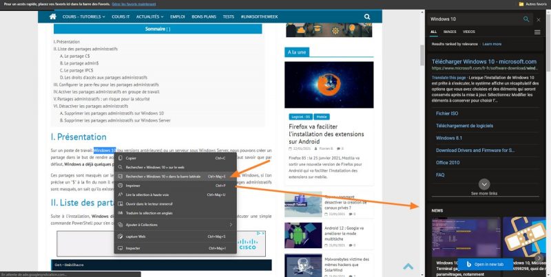 La fonctionnalité de recherche dans la barre latérale est disponible pour tous. Lorsque vous êtes sur une page et que vous sélectionnez du texte, vous pouvez effectuer une recherche dans la barre latérale via le clic droit. Ainsi, la recherche s'effectue sans quitter l'onglet actif. Si vous cliquez sur un résultat, alors la page s'ouvrira dans un nouvel onglet.
