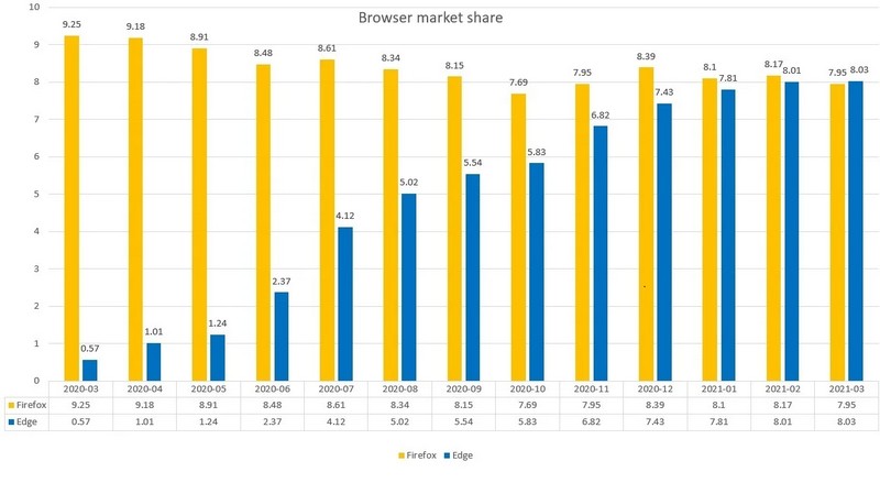 Cette amélioration se traduit par une adoption de la part d'un plus grand nombre d'utilisateurs. D'après un rapport publié par StatCounter, Edge est passé de 0.57% de part de marché à 8.03% entre mars 2020 et mars 2021. Sur une année, cela représente une progression de 1 308%. A l'inverse, le navigateur Edge Legacy tend à disparaître et représente en mars 2021 une part de marché de 0,44%.