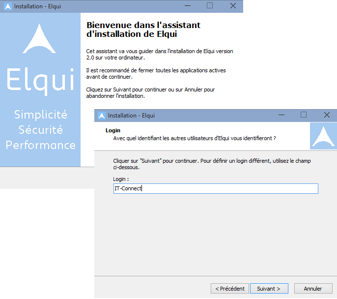 Après l'avoir téléchargé, lancez l'exécutable et suivez l'assistant d'installation. Il vous sera demandé où vous souhaitez installer Elqui, un login et le chemin d'un répertoire où seront stockés les fichiers reçus.