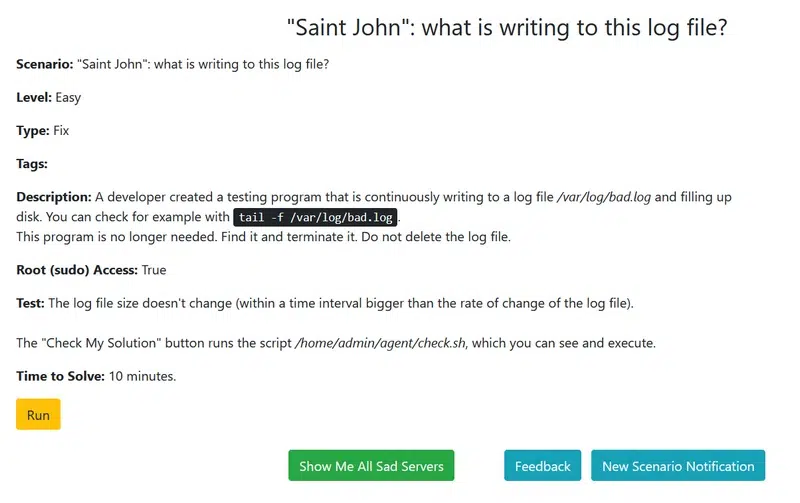 SadServers est une solution SaaS qui permet aux utilisateurs de mettre à l’épreuve leurs compétences en dépannage Linux (système, Docker, Kubernetes, etc.) sur de vrais serveurs, dans un esprit "Capture the Flag". Ce sera l'occasion de tester vos compétences pour la gestion des services, l'analyse de logs, le diagnostic de problèmes de connectivité, de permissions ou d'espace disque, ou encore des problèmes de performance.