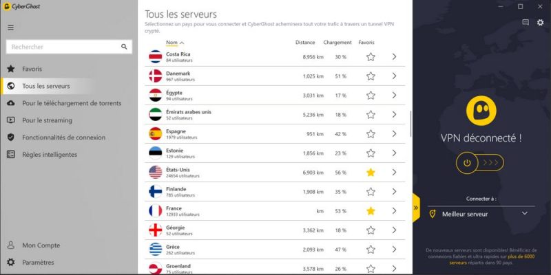 Pour assurer un bon niveau de performance et assurer un service de qualité auprès de ses clients répartis dans le monde entier, CyberGhost VPN s'appuie sur plus de 6 500 serveurs situés dans 90 pays différents. Par exemple, en France, CyberGhost dispose de 490 serveurs situés à Paris en grande majorité ainsi qu'à Strasbourg.