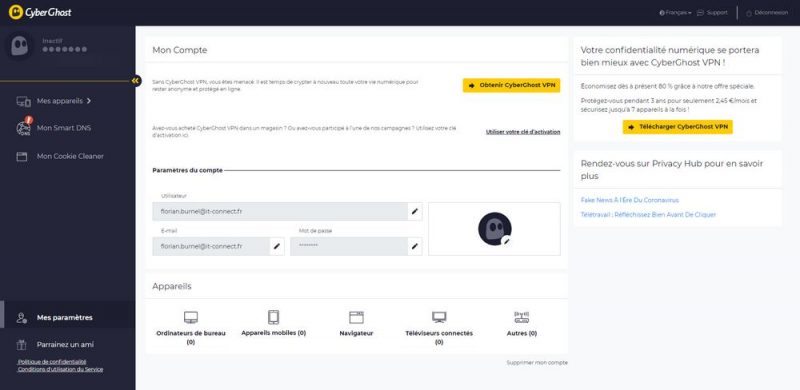 Après s'être inscrit sur CyberGhost VPN, il faudra souscrire à un abonnement pour profiter du VPN et télécharger les applications. Le tableau de bord est plutôt sympa, notamment pour accéder à la liste de ses appareils et la gérer.