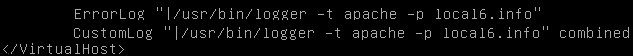 Ici, on redirige les logs d'erreur et les logs d'accès vers l'outil qui permet d'écrire les logs en affectant le mot clé "apache" et la facilitie "local6. Dans un deuxième temps, nous allons aller dans le fichier "/etc/rsyslog.conf" et y ajouter cette ligne :