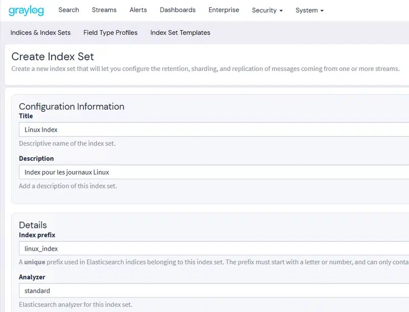 Nous devons créer un Index dans Graylog pour stocker les journaux des machines Linux. Un index dans Graylog est une structure de stockage qui contient les logs reçus, c'est-à-dire les messages reçus. Graylog utilise OpenSearch comme moteur de stockage et les messages sont indexés pour permettre des recherches rapides et efficaces.