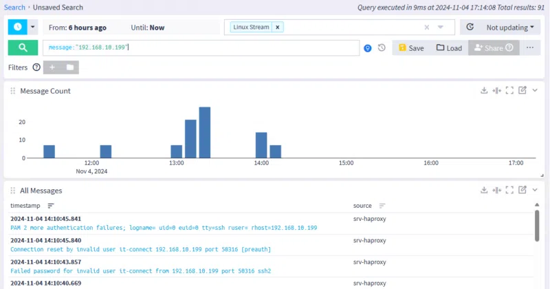 Les tentatives de connexion infructueuses sont effectuées à partir de la machine avec l'adresse IP "192.168.10.199". Si vous souhaitez en savoir plus sur l'activité de cet hôte, vous pouvez effectuer une recherche sur cette adresse IP. Graylog vous sortira tous les logs où cette adresse IP est référencée, sur tous les hôtes (pour lesquels l'envoi de logs est configuré).