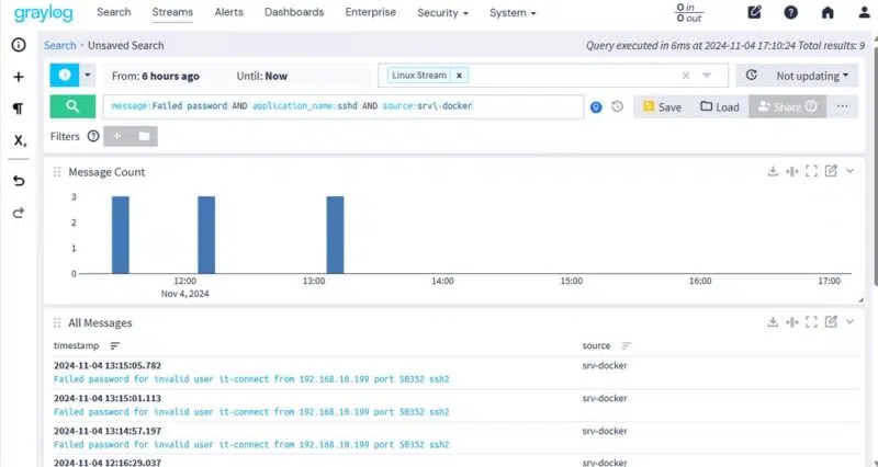 Sur Graylog, utilisez le filtre de recherche suivant pour afficher uniquement les messages correspondants :