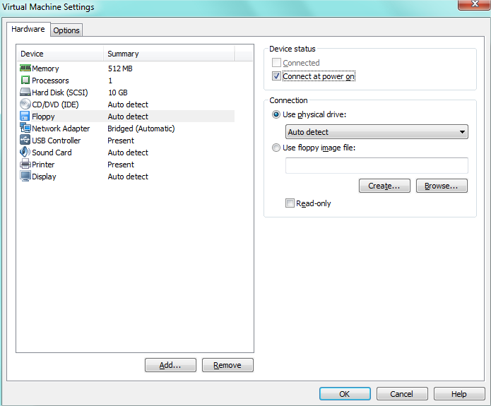Il se peut que ça ne suffise pas pour se débarrasser d’Easy Install, parce qu’il force le chargement du fichier dans le lecteur disquette ou alors il crée un second lecteur CD dans votre VM pour monter le fichier sous forme d’ISO dans la VM, dans ce cas :