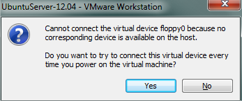 Si vous obtenez le message indiqué ci-dessous lors du démarrage de la VM, cliquez sur « No ». VMware vous indique qu’il ne trouve pas de lecteur disquette sur votre machine donc voulez vous essayer de le connecter à chaque fois.