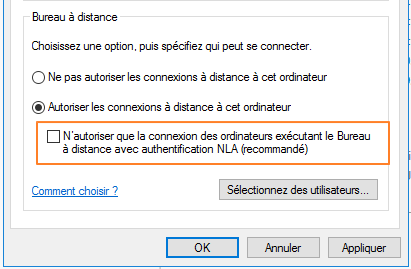 Sinon, bien que ce soit déconseillé, vous pouvez désactiver l'option "N'autoriser que la connexion des ordinateurs exécutant le Bureau à distance avec authentification NLA (recommandé)" sur votre serveur. Ensuite, ça fonctionnera mais ça ne doit être qu'une éventuelle solution de secours en attendant d'installer le patch !