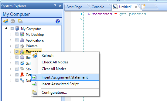 - Explorer le système : visualisez vos tâches planifiées, vos processus actifs, vos imprimantes, vos applications.... Avec le logiciel, notamment pour obtenir la commande PowerShell qui permet d'obtenir une information, et la possibilité de l'insérer directement dans un script. On peut aussi exécuter des actions depuis l'application, par exemple sélectionner un processus et le stopper (Stop-Process), ou modifier sa priorité (Set-ProcessPriority). Il est possible d'ajouter ces propres objets personnalisés.