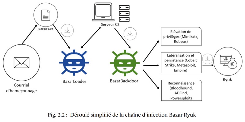 Avant que la phase de post-exploitation intervienne, il arrive fréquemment qu'un loader soit déployé sur l'infrastructure cible. L'intérêt pour les attaquants est de pouvoir récupérer des informations pour faciliter les mouvements latéraux et les accès ultérieurs. Dans un précédent article, je vous avais parlé de la chaîne d'infection Bazar-Ryuk.