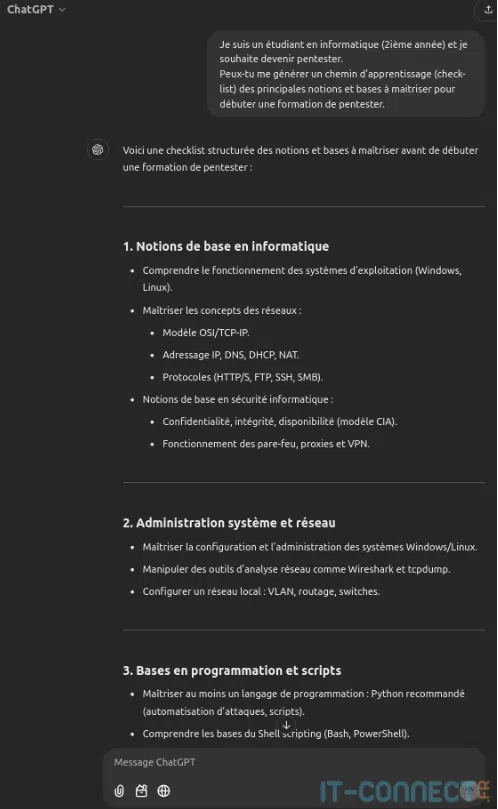 Suivre un chemin d’apprentissage clair et logique permet de limiter ces lacunes. Les LLM peuvent vous suggérer un fil conducteur, par exemple, en vous indiquant quelles sont les notions de bases à connaitre avant de vous attaquer à un sujet plus complexe. Voici, en exemple, un prompt dans lequel je demande les bases à connaitre pour aborder une formation de pentester (expert en tests d’intrusion et cybersécurité offensive) :