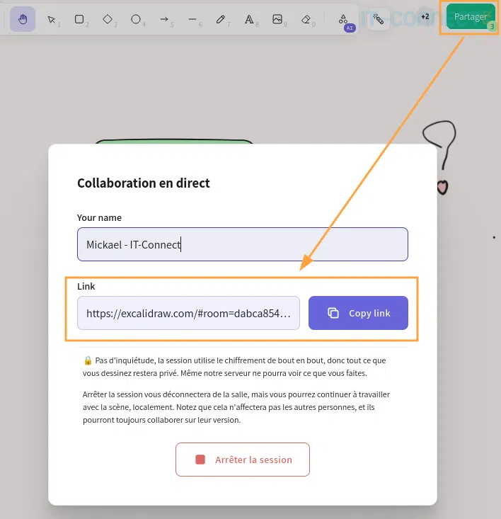 La synchronisation des modifications se fait en temps réel et nous pouvons voir l’identité des différentes personnes connectées. Le partage d’un schéma se fait via une URL disposant un lien unique :