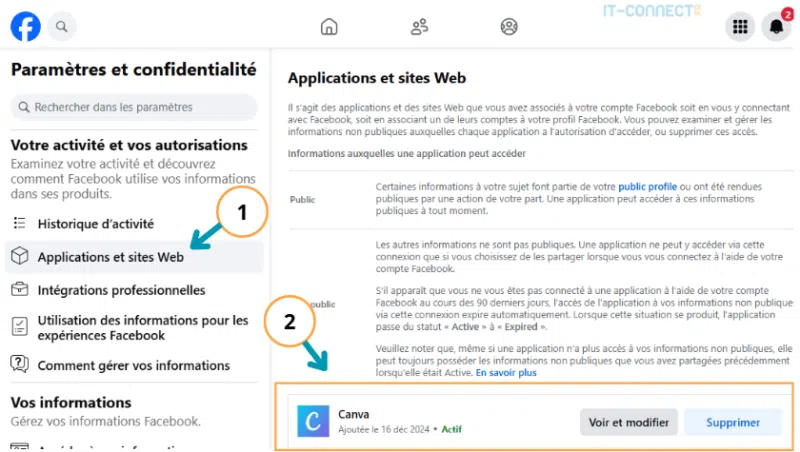 On peut ici, par exemple, voire que l’application Web “Canva” utilise mon compte Facebook pour m’authentifier.