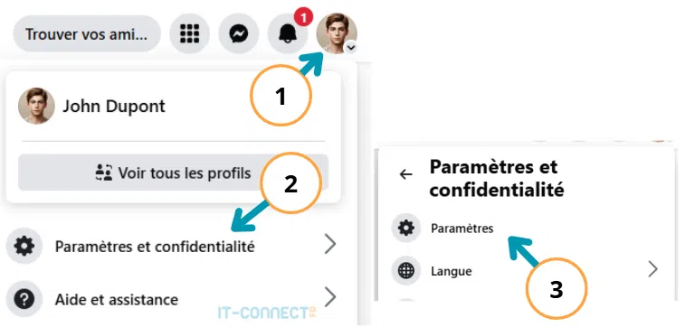 - Accéder au site de Facebook depuis un ordinateur. Cliquez sur votre icône de profil en haut à droite, puis allez dans Paramètres et confidentialité > Paramètres (ou cliquez ici pour accéder à la page des paramètres).