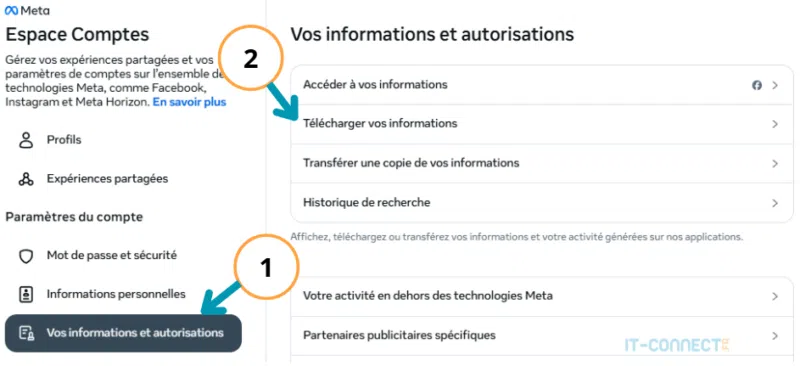 - Dans la barre latérale gauche, ouvrez Voir plus dans l'Espace Comptes, puis cliquez sur Vos informations et autorisations > Télécharger vos informations