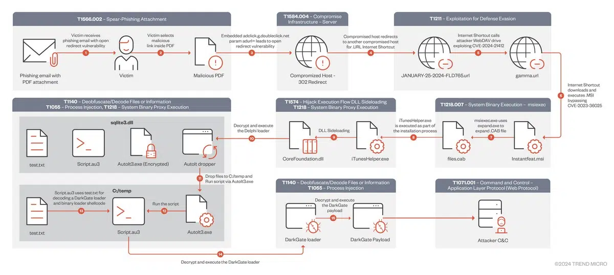 Désormais, c'est un second rapport publié par Trend Micro qui évoque l'exploitation de cette vulnérabilité par un autre groupe de pirates, cette fois-ci dans le but de déployer le malware DarkGate. Cette campagne a été repérée mi-janvier 2024.